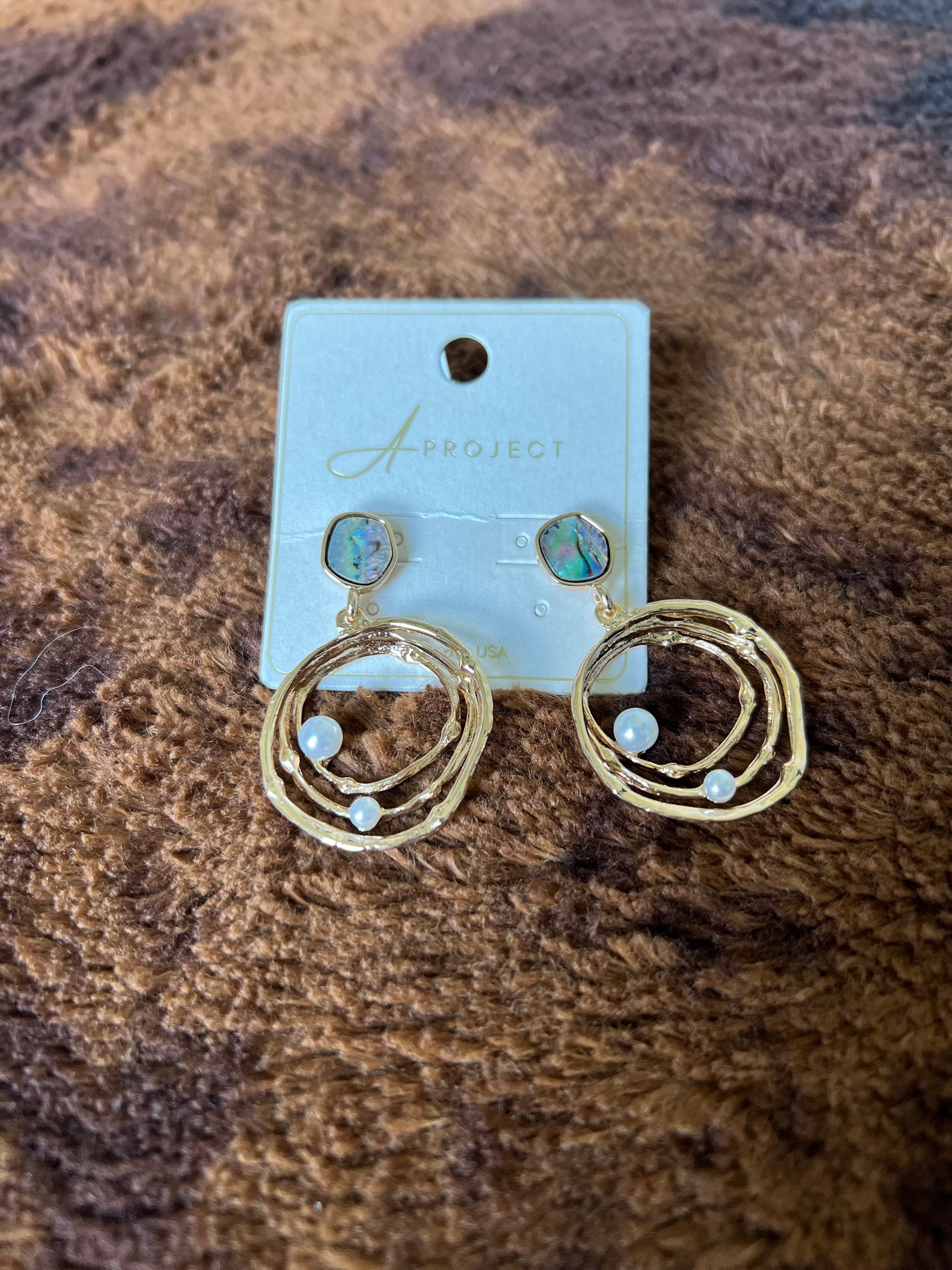 Abalone shell, gold and pearl lightweight earrings.